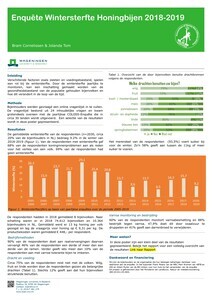 - De landelijke wintersterfte van bijenvolken bedroeg 9% en 69% van de deelnemers gaf aan geen wintersterfte van bijenvolken te hebben.