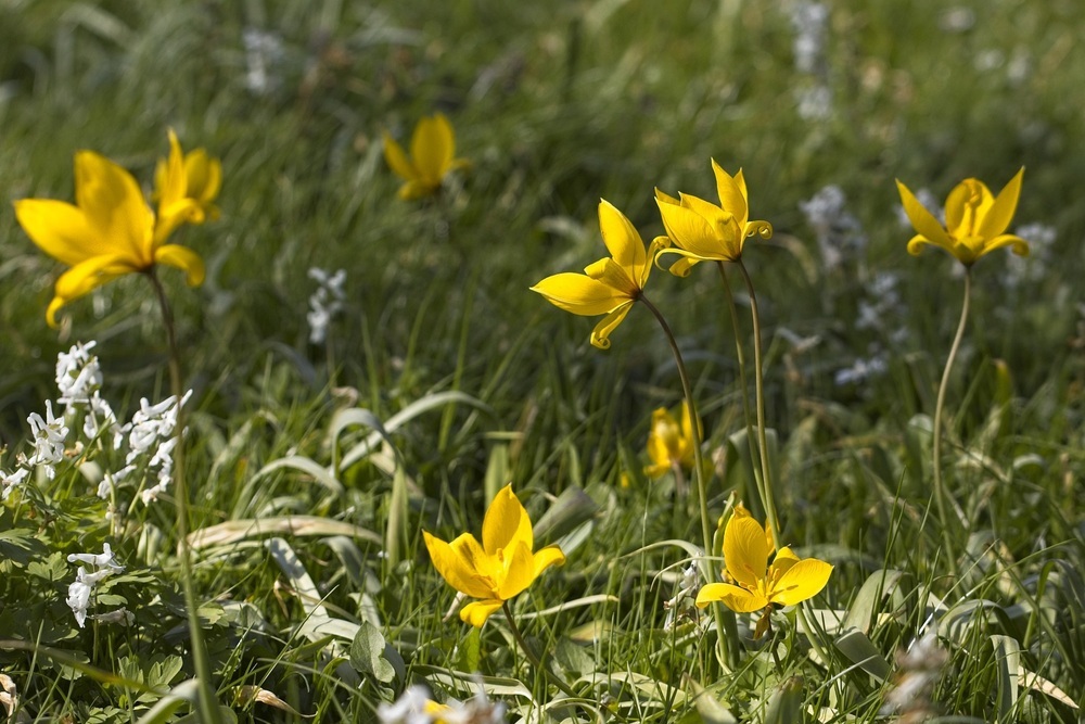 Wat de denken van botanische tulpen met de bostulp (Tulipa sylvestris), de gele ster die schijnt als de kerstster is uitgedoofd. De kleine laagbloeiende Turkestaanse tulp (T. turkestania) kan op een zonnige dag bezaaid zijn met bestuivende insecten.