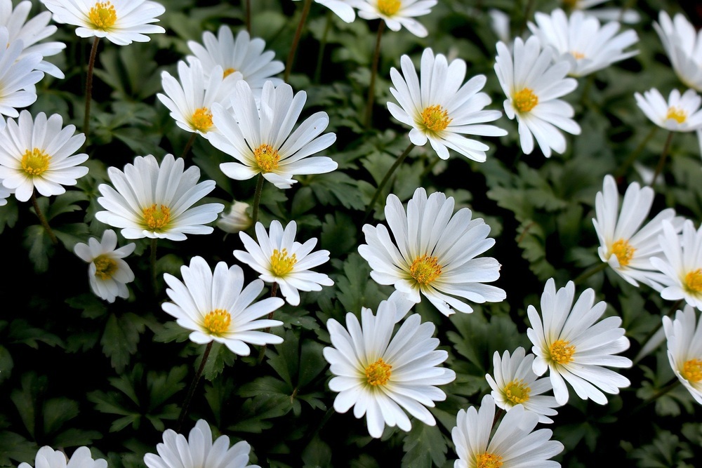 Anemonen zijn bij uitstek stuifmeelleveranciers. Der blauwe anemoon (Anemone apennina) en de bosanemoon (A. nemerosa) zijn er in diverse variëteiten te krijgen. Ook de soort A. blanda is een aanwinst.