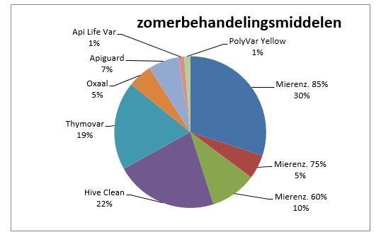 - 4% van de deelnemers voerde geen enkele behandeling meer uit. De reden hiervoor was tweeledig: of men deed het uit principe niet en kiest hiermee voor een natuurlijke selectie (de sterke volken blijven over) of men heeft niet behandeld vanwege de geringe mijtenval.