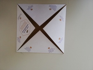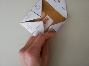 Draai het vierkantje om zodat de witte kant aan de bovenzijde ligt en je de flapjes ziet ofwel hoekjes die open zijn. Pak de punt van één zo’n flapje en vouw deze weer naar de punt in de hoek. Doe dit ook met de andere drie flapjes.